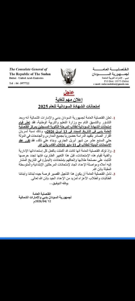 أعلنت القنصلية السودانية في دبي تعذر قيام امتحانات الشهادة السودانية في مركزها المحدد سلفاً (في الشارقة)، وذلك قبل أقل من 48 ساعة من الموعد المضروب.